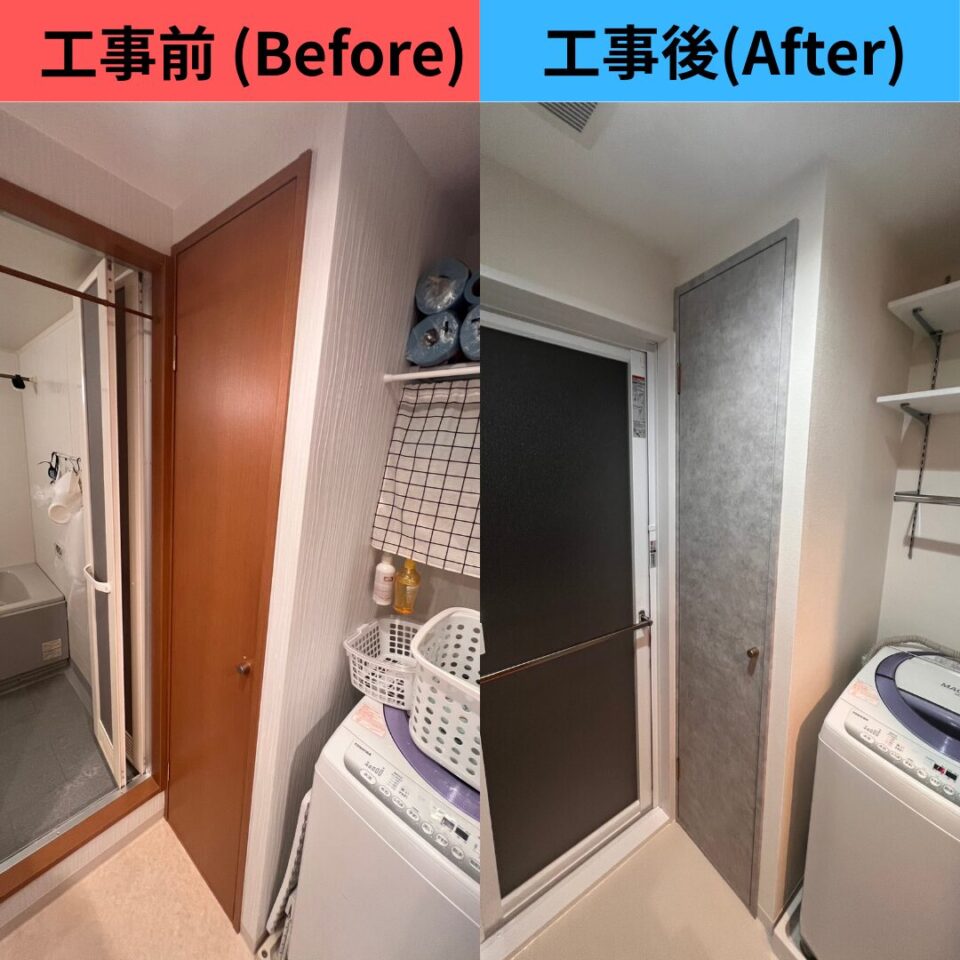今回は、収納扉をまわりのCF(クッションフロア)や洗面化粧台の色見に合わせて、